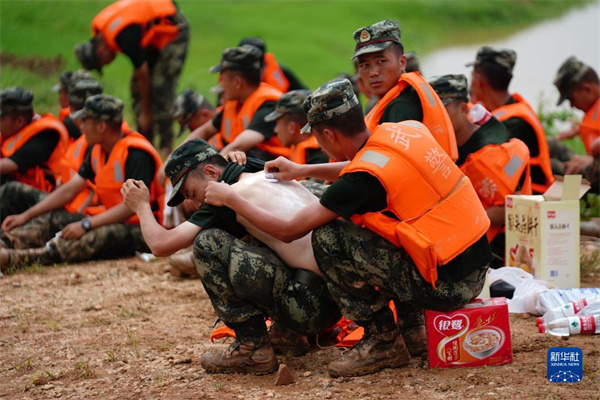 在江西省鄱陽(yáng)縣鄱陽(yáng)鎮(zhèn)江家?guī)X村,武警官兵在休息時(shí)互相涂抹藥粉,連日奮戰(zhàn)讓許多戰(zhàn)士長(zhǎng)痱子或曬傷(2020年7月11日攝)。來(lái)自武警江西省總隊(duì)機(jī)動(dòng)支隊(duì)的官兵與當(dāng)?shù)馗刹、村民一起連續(xù)奮戰(zhàn),用沙袋和土石在昌江堤上壘起了一道一米多高、三公里長(zhǎng)的臨時(shí)防水墻。新華社記者 周密 攝