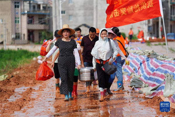 在江西省鄱陽(yáng)縣鄱陽(yáng)鎮(zhèn)江家?guī)X村,由平均年齡超過(guò)五十歲的阿姨們組成的抗洪“阿姨團(tuán)”給武警戰(zhàn)士送來(lái)綠豆湯(2020年7月11日攝)。新華社記者 周密 攝