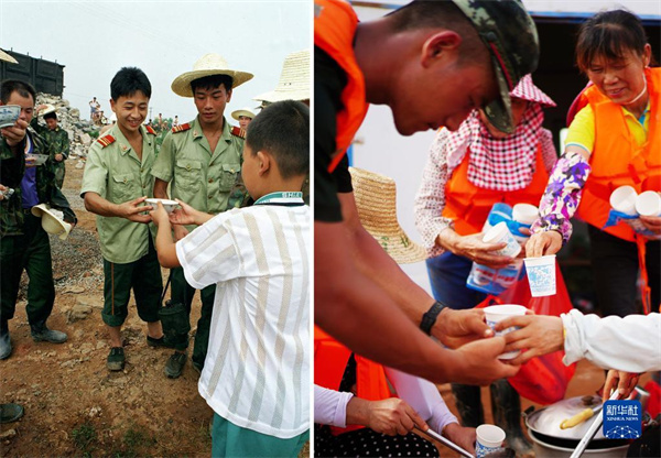 這是一張拼版照片,左圖為:在江西永修,學(xué)生為護(hù)堤搶險(xiǎn)的武警官兵送水(新華社記者宋振平攝于1998年7月28日);右圖為:在江西鄱陽(yáng)江家?guī)X村,村民為前來(lái)抗洪搶險(xiǎn)的武警官兵盛綠豆湯(新華社記者周密攝于2020年7月11日)。新華社發(fā)