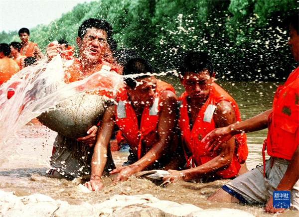 湖北石首久合垸鄉(xiāng)團(tuán)山河支堤出現(xiàn)“管涌”險(xiǎn)情,解放軍官兵立即奔赴險(xiǎn)段,以血肉之軀擋住肆虐的洪水,減低洪水的沖擊力,同時(shí)加固堤防(1998年8月11日攝)。新華社發(fā)(資料照片)