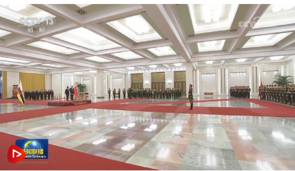 2月6日上午,國家主席習近平在北京人民大會堂同來華進行國事訪問的文萊蘇丹哈桑納爾舉行會談。這是會談前,習近平在人民大會堂北大廳為哈桑納爾舉行歡迎儀式。