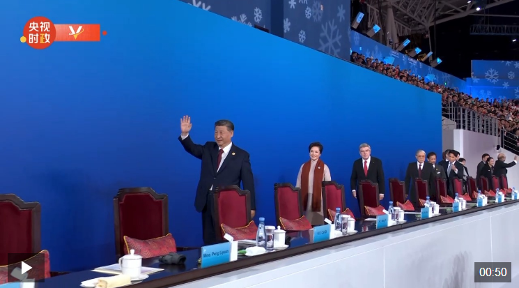 19時58分,在《和平——命運共同體》的樂曲聲中,習(xí)近平和夫人彭麗媛,同國際奧委會主席巴赫、亞奧理事會第一副主席霍震霆等步入主席臺,向觀眾揮手致意。全場響起長時間的熱烈掌聲。