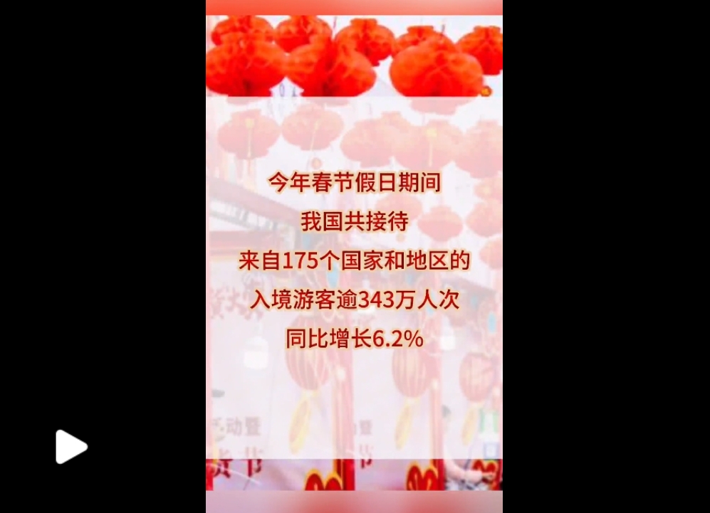 首個(gè)“非遺版”春節(jié),普天同慶,五洲同春。“來華體驗(yàn)中國年”,是其中一道動(dòng)人的風(fēng)景。中國的高鐵上、景區(qū)里,時(shí)?梢娡鈬慰偷纳碛啊(shù)據(jù)顯示,今年春節(jié)假日期間,我國共接待來自175個(gè)國家和地區(qū)的入境游客逾343萬人次,同比增長(zhǎng)6.2%。