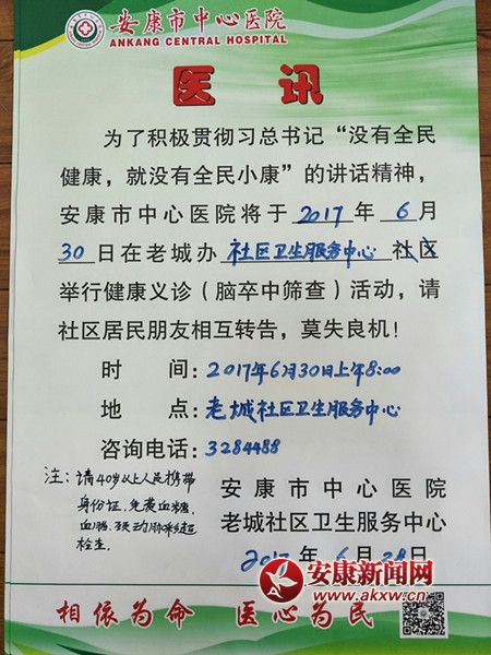 安康新聞網(wǎng)訊(通訊員 成英豪)為了積極貫徹習(xí)近平總書記“沒有全民健康,就沒有全民小康”的講話精神,安康市中心醫(yī)院將派出專家團(tuán)隊(duì)于2017年6月30日在漢濱區(qū)老城……