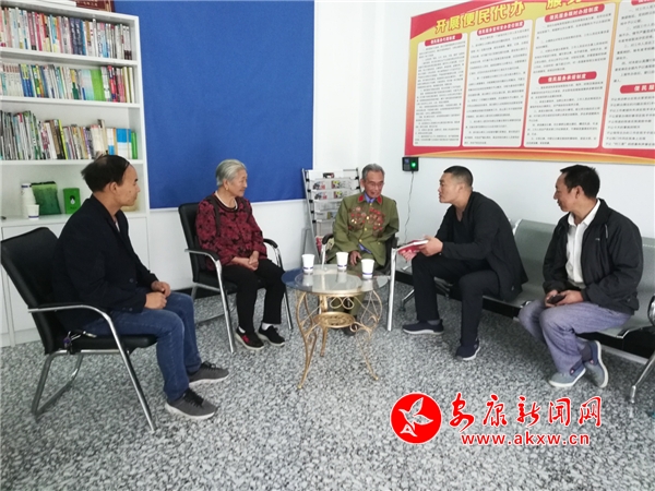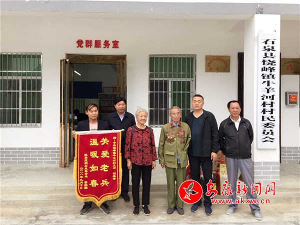 安康新聞網(wǎng)訊(通訊員 楊曉莉 王全軍 )“感謝牛羊河村委會(huì),感謝你們駐村工作隊(duì)!”身著退伍軍裝,勛章掛滿胸前的抗美援朝老兵董安國(guó)握著石泉縣饒峰鎮(zhèn)牛羊河村駐村工作隊(duì)隊(duì)長(zhǎng)王全軍的手連連道謝。大家還在納悶中,繡著“關(guān)愛老兵,溫暖如春”的錦旗由董安國(guó)夫人、牛羊河村村籍的王武英遞到了村支書張榮全手中。
