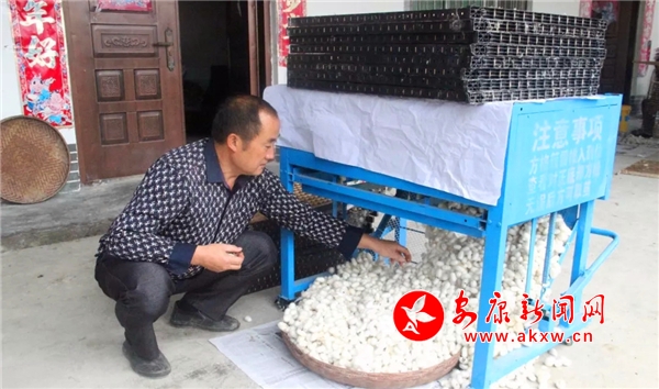 安康新聞網(wǎng)訊(通訊員 沈沙沙 魅力迎豐)“我今年養(yǎng)了20張蠶,在摘繭的時候這臺取繭機(jī)可幫了我們家的大忙。”和蔡明勇交談間,他的妻子已快速取下五六片塑框木質(zhì)方格蔟上的蠶繭,簸箕上堆滿了白花花的蠶繭。