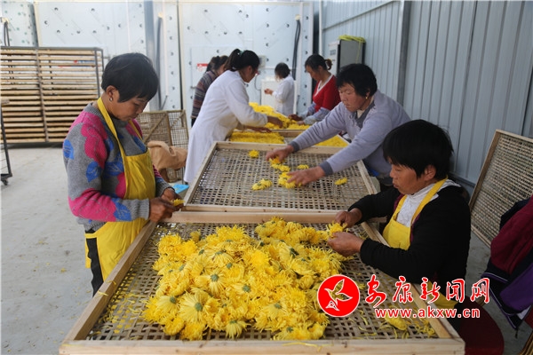 五愛(ài)村群山環(huán)繞,空氣清新,良好的自然生態(tài)環(huán)境成為金絲皇菊孕育生長(zhǎng)的絕佳之地。最近幾天正值金絲皇菊的盛花期,菊?qǐng)@內(nèi),人們趁著好天氣忙著采菊,眉眼里盡顯豐收的喜悅。合作社里,10余名工人正在挑揀、擺放剛采回來(lái)的菊花。負(fù)責(zé)人譚小燕說(shuō),這些形態(tài)嬌媚,金黃艷麗的金絲皇菊經(jīng)過(guò)72小時(shí)的恒溫烘烤,便可成為一款天然健康的飲品:金絲皇菊茶。