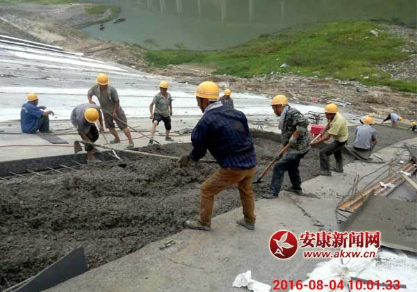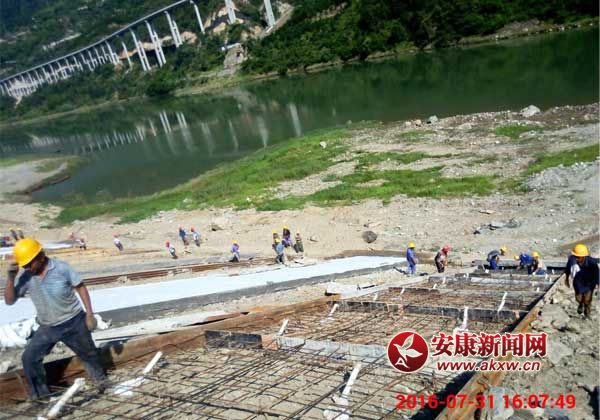 晏溝料場是旬陽水電站工程建設(shè)砂石料篩分基地,近30余萬方的渣土堆砌在漢江右岸,正值漢江主汛期,一旦遭遇漢江洪水,后果不堪設(shè)想,解決料場的防洪安全是保障水電站工程建設(shè)的關(guān)鍵。當(dāng)?shù)卣徒ㄔO(shè)單位精心組織,拼搶施工,重點(diǎn)對臨江200余米長、40余米高的料場截面采用混泥土面板防護(hù)工程措施,經(jīng)過一周時間的連續(xù)奮戰(zhàn),提前4天順利完成江岸料場防護(hù)工程節(jié)點(diǎn)任務(wù)。