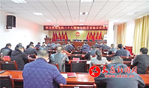黨的二十大為新時代新征程黨和國家事業(yè)發(fā)展、實現(xiàn)第二個百年奮斗目標擘畫了發(fā)展藍圖、規(guī)劃了實踐路徑、作出了戰(zhàn)略部署。旬陽市委第一時間召開會議、印發(fā)通知,要求全市各級黨組織和廣大黨員把學習宣傳貫徹黨的二十大精神作為當前和今后一個時期的重大政治任務,迅速興起學習熱潮。去年10月24日以來,市委先后召開6次會議集中學習黨的二十大精神,10月28日,全市黨員干部學習黨的二十大精神集中培訓會順利召開,11月22日,旬陽市黨的二十大精神宣講工作全面啟動,市委書記陳紅星在城關鎮(zhèn)開展黨的二十大精神首場宣講,以上率下做好宣講“頭等大事”。市委書記的帶頭宣講宛如一聲“發(fā)令槍”,引領全市宣講不斷走深走實。隨后,其他市級領導、各鎮(zhèn)黨委書記和市直部門主要負責同志,均深入基層或在分管領域、本單位本系統(tǒng)開展宣講90余場次,切實推動黨的二十大精神進黨政機關、進企事業(yè)單位、進城鄉(xiāng)社區(qū)、進校園課堂、進各類新經濟組織和新社會組織。